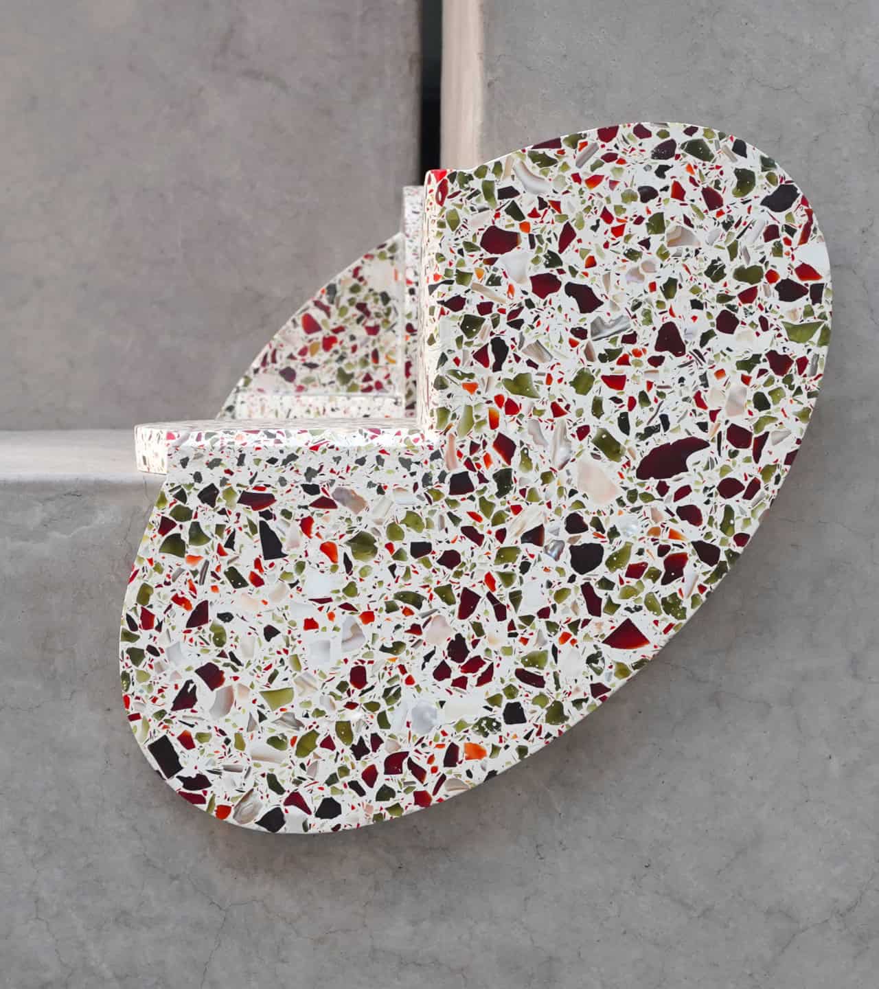 We collaborated with well-established local Bay Area artist, Gay Outlaw, on a few large-scale public art pieces that were commissioned for San Francisco International Airport. We created the concrete base for her piece titled Shell as well as the entire piece titled Intersection. Intersection consists of two large identical structures that appear as a deconstructed cube that has been put back together in a new configuration. This piece has custom terrazzo “buttons” that have been arranged on the surfaces of the pieces as well as in the places where they are joined.